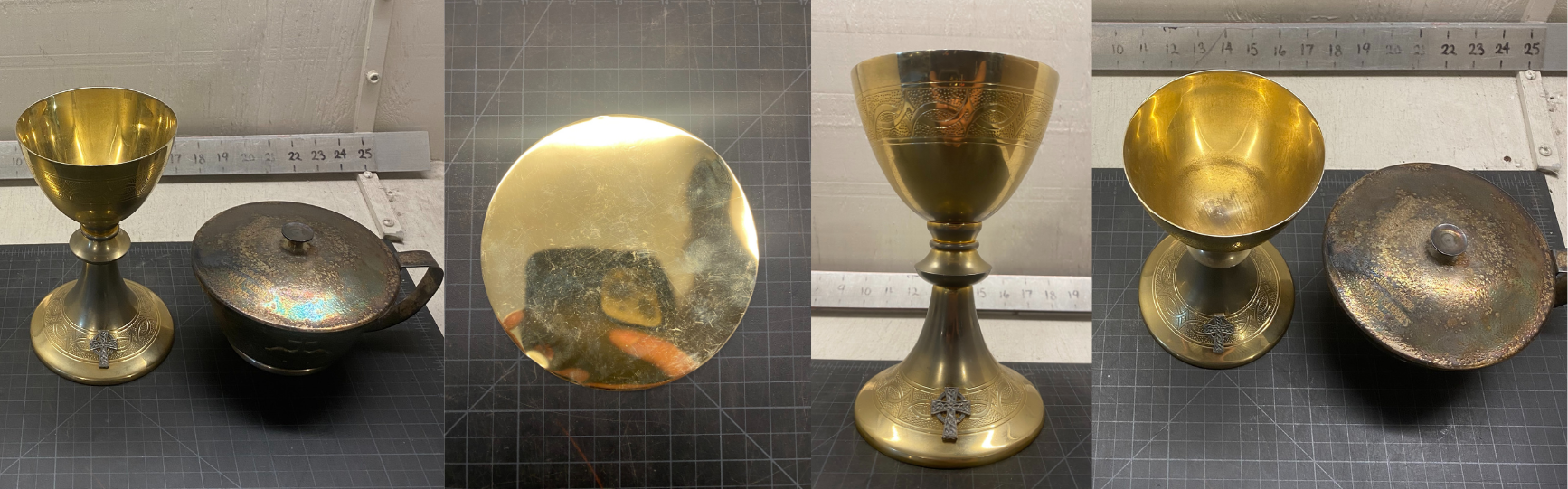 Thin metals will be eaten away enough that just refinishing once will not be possible. A good way to check your chalices and ciboriums, is to try and squeeze the cup area. If you cannot, the metal is thick enough to withstand several refinishings over the years are built to last at least a century.